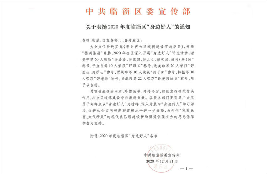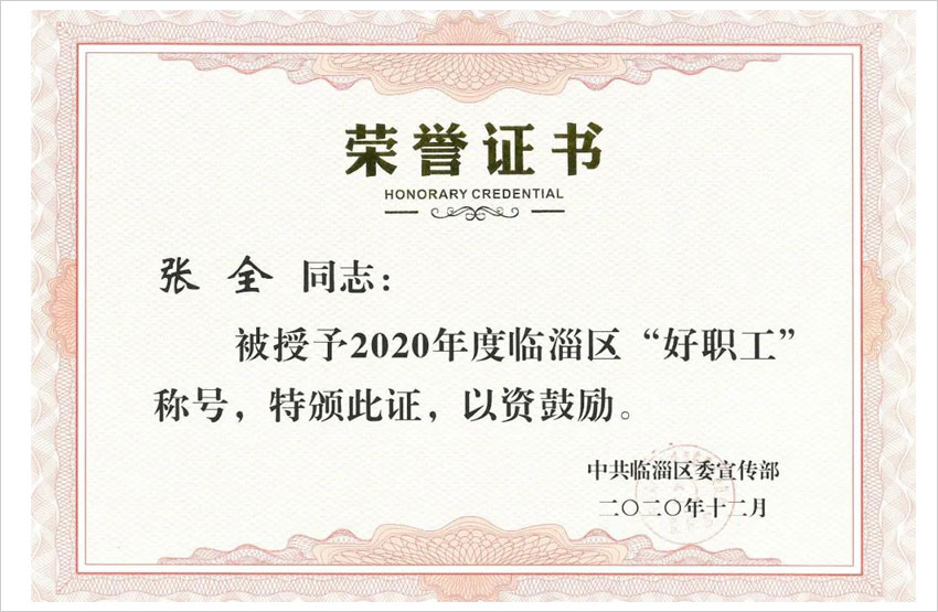 為全方位推進(jìn)實(shí)施《新時(shí)代公民道德建設(shè)實(shí)施綱要》,擦亮“德潤(rùn)臨淄”品牌,由中共臨淄區(qū)委宣傳部、臨淄區(qū)總工會(huì)組織的2020年度臨淄區(qū)深入開(kāi)展“身邊好人”評(píng)選活動(dòng)近日揭曉,我公司鉚焊一車間員工張全榜上有名,被表彰為臨淄區(qū)“好職工”榮譽(yù)稱號(hào)。